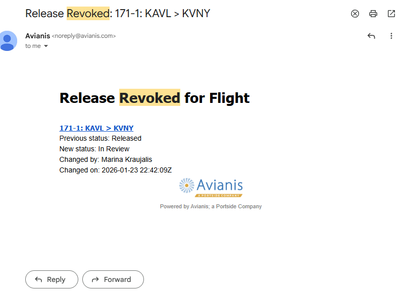 Receive email notifications when a previously released flight regresses to an unreleased status.