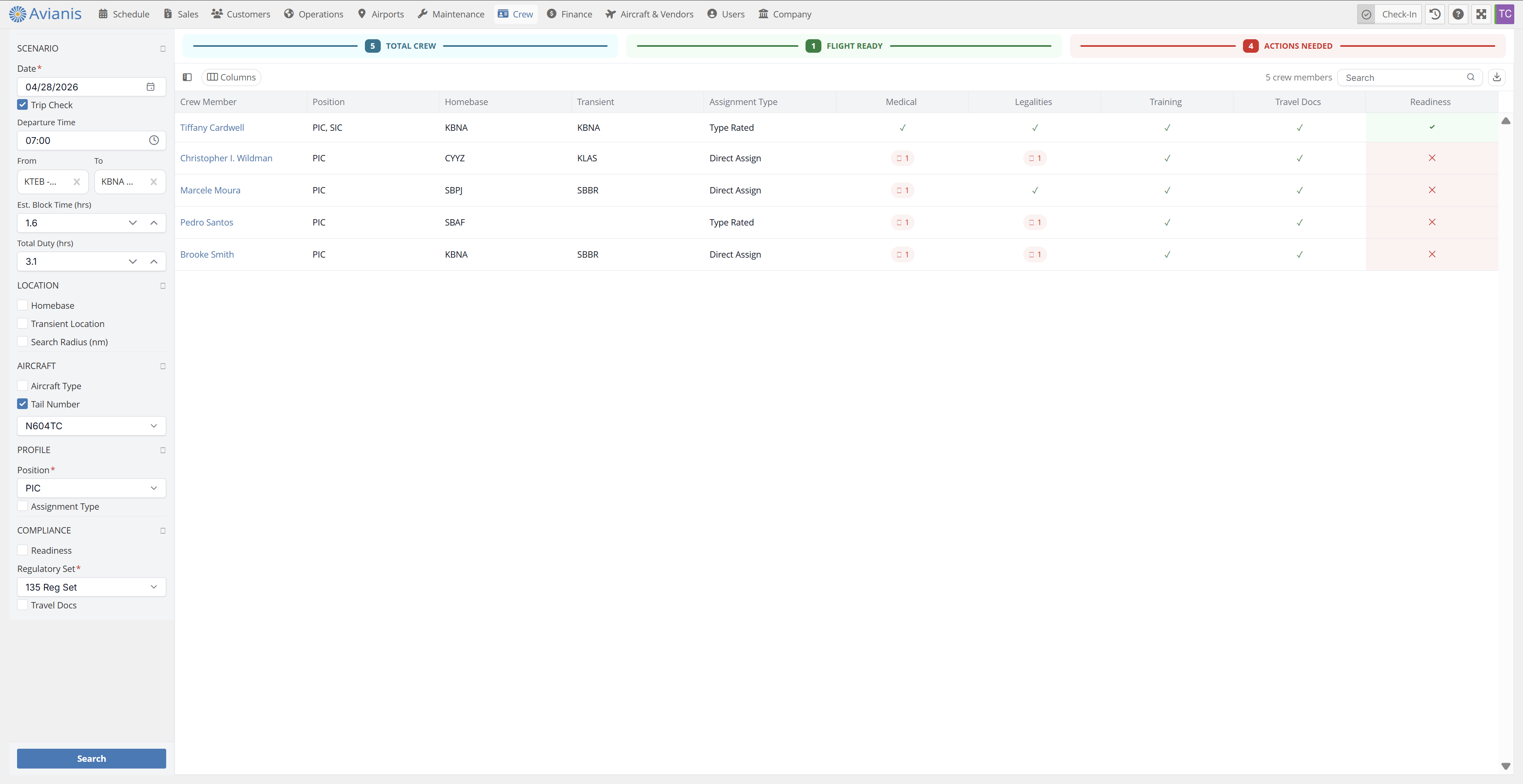 - Readiness – filter by Flight Ready or Not Ready to quickly identify available or flagged crew