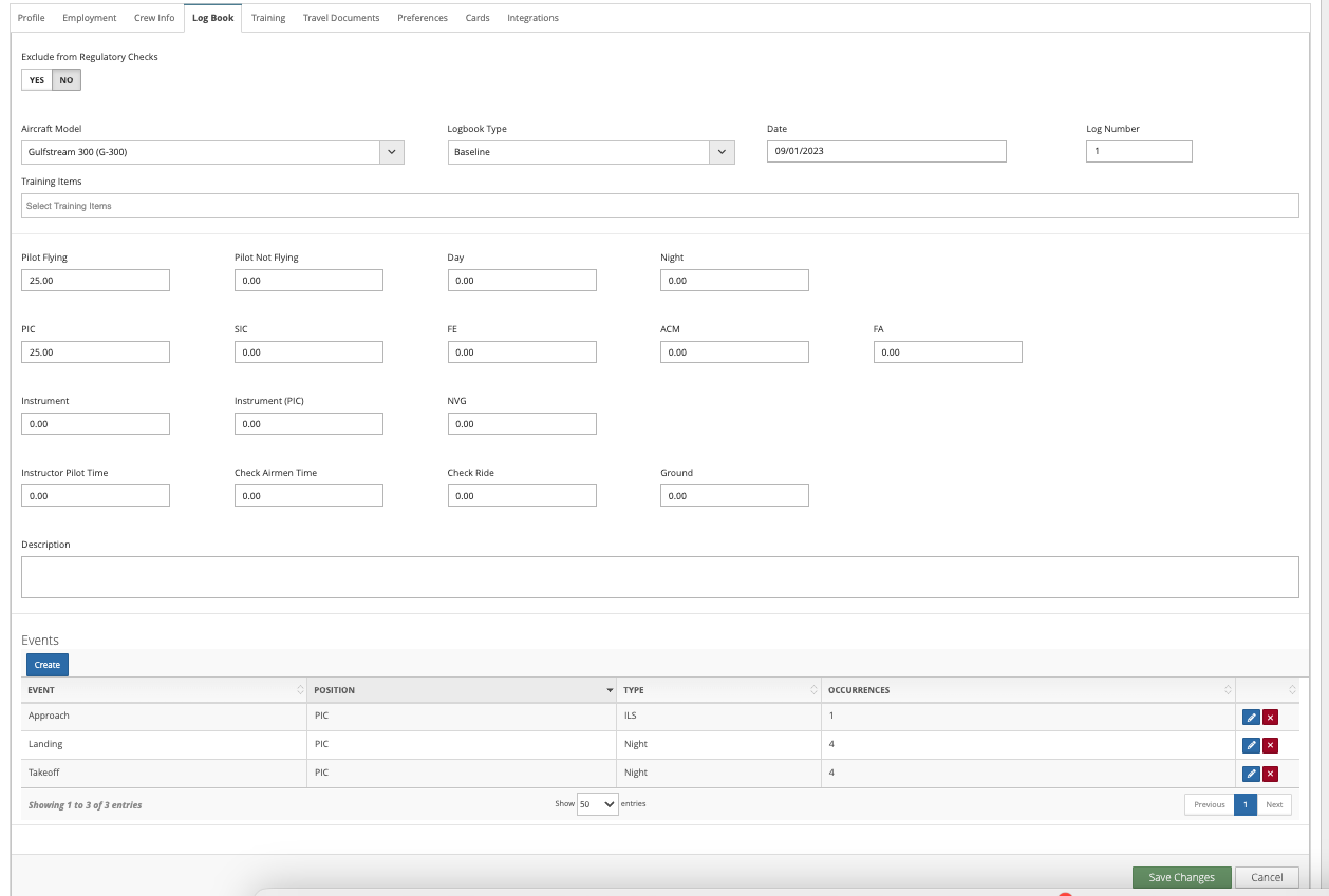 Creating aircraft specific log book entries (previous/current time flown or contract work) regarding flight time and/or flight events (take-off, landings, etc.) Note: for the ARGUS and Wyvern interface, be sure to create a minimum of one aircraft type log book entry (type should match the type rating in Avianis and ARGUS/Wyvern). This allows an operation to send the aircraft time in type.