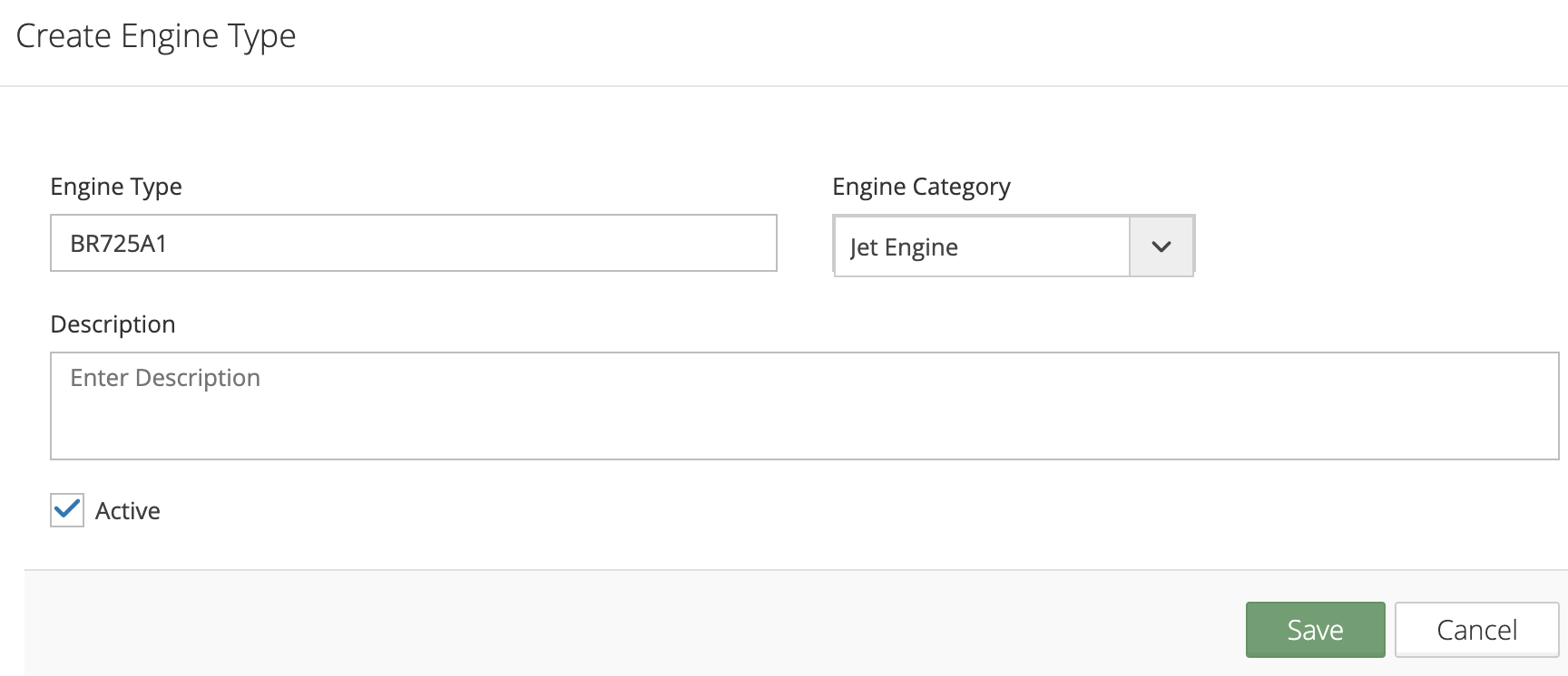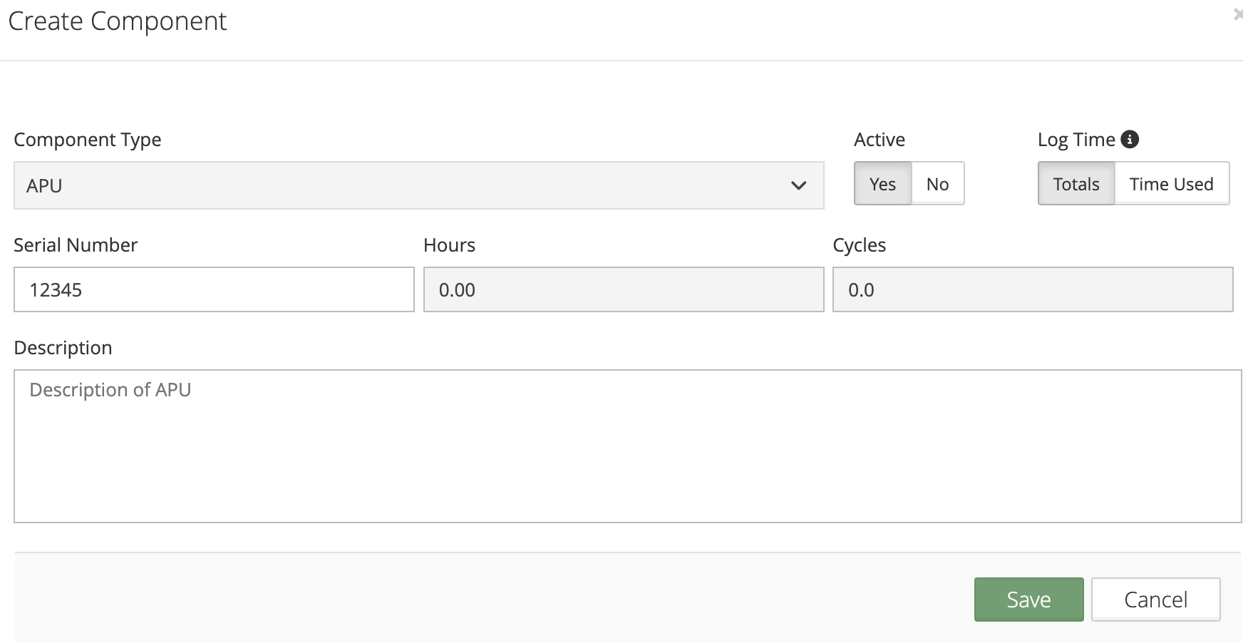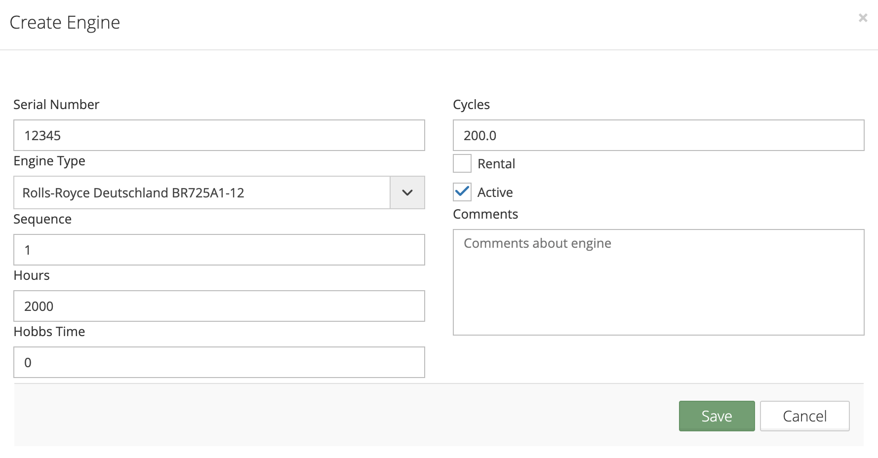 Enter the serial number, type, sequence, hours and/or Hobbs and cycles, make active and click "Save"