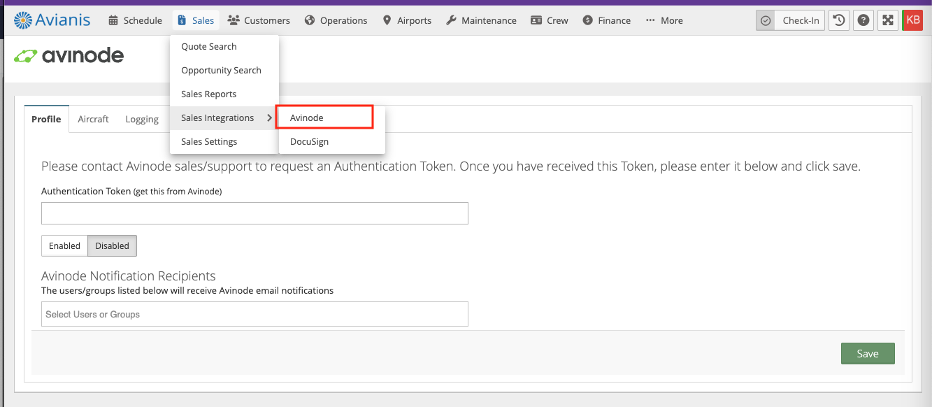 Go to Sales > Sales Integrations > Avinode