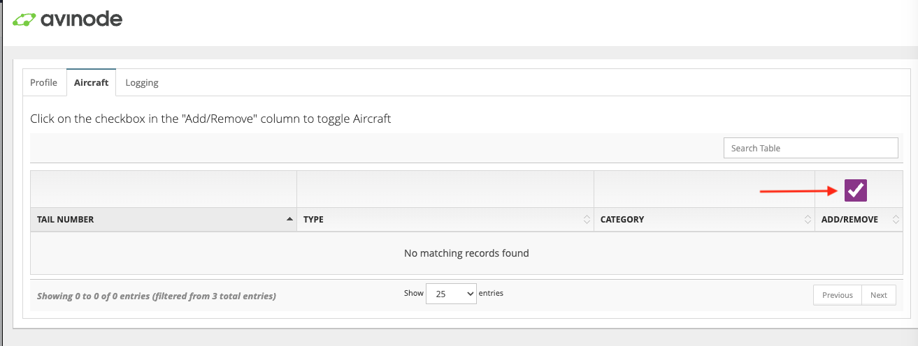 Click the checkbox above the Add/Remove column and click the Add button next to each aircraft you want to add to the integration.