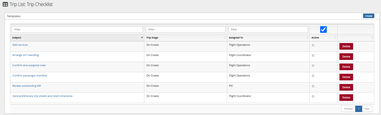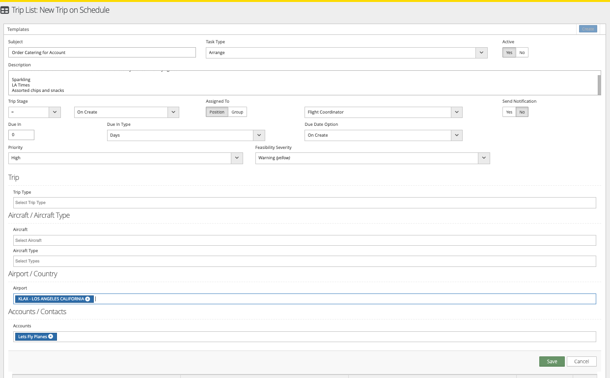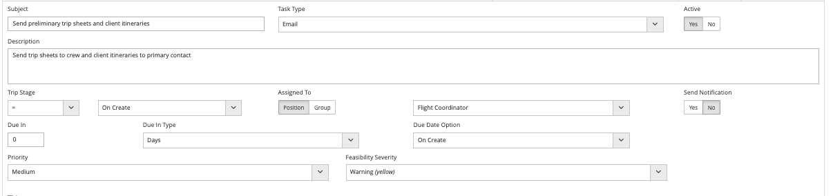 Trip specific tasks can be initiated automatically on creation of the trip or at any stage through the process. In addition, conditions can be set for any trip task item so it only creates when a specific situation occurs. The conditions that can be set are aircraft/aircraft type, airport/country and accounts/account type/contacts.