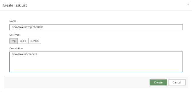 Enter in the name for the Task List, select if the task list will be based off a trip, quote, or general and finally add in a description
