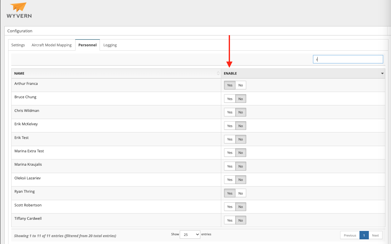 4. Select the Personnel and enable each personnel you would like to sync to Wyvern. This must be Enabled for the manual sync to function.