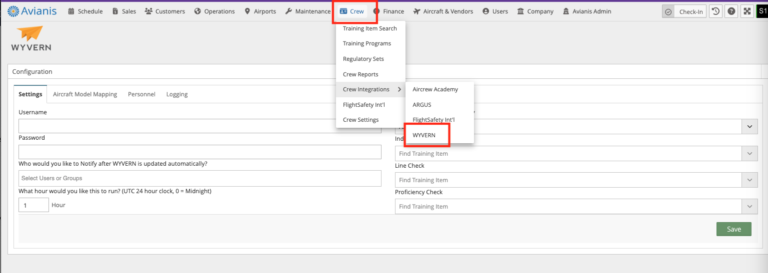 To utilize the Wyvern integration with Avianis, first create dedicated Wyvern credentials for Avianis in Wyvern, then turn the Wyvern syncing on in Avianis.