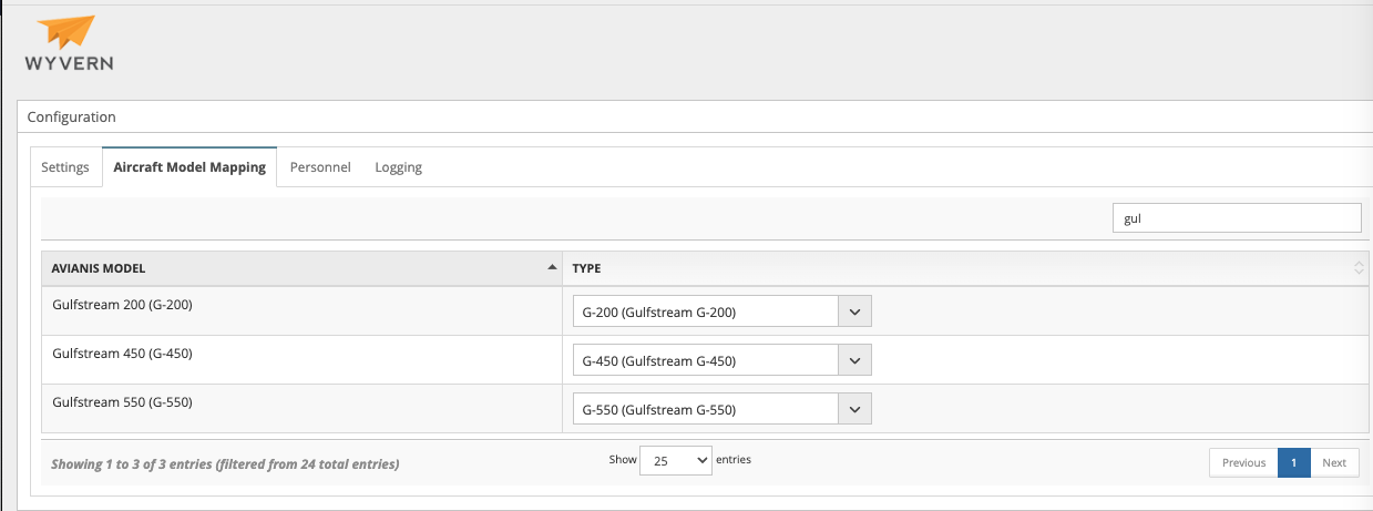 3. Select the 'Aircraft Model Mapping' tab and select the Wyvern Model Type Code for each aircraft in Avianis.