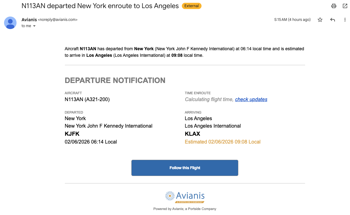 Once flight following has been setup and enabled for an aircraft, there are several options for automatic email notifications of aircraft movements. The email will be sent from noreply@avianis.com. It is suggested this email is added to the recipient's address book so the notifications do not get flagged as spam.