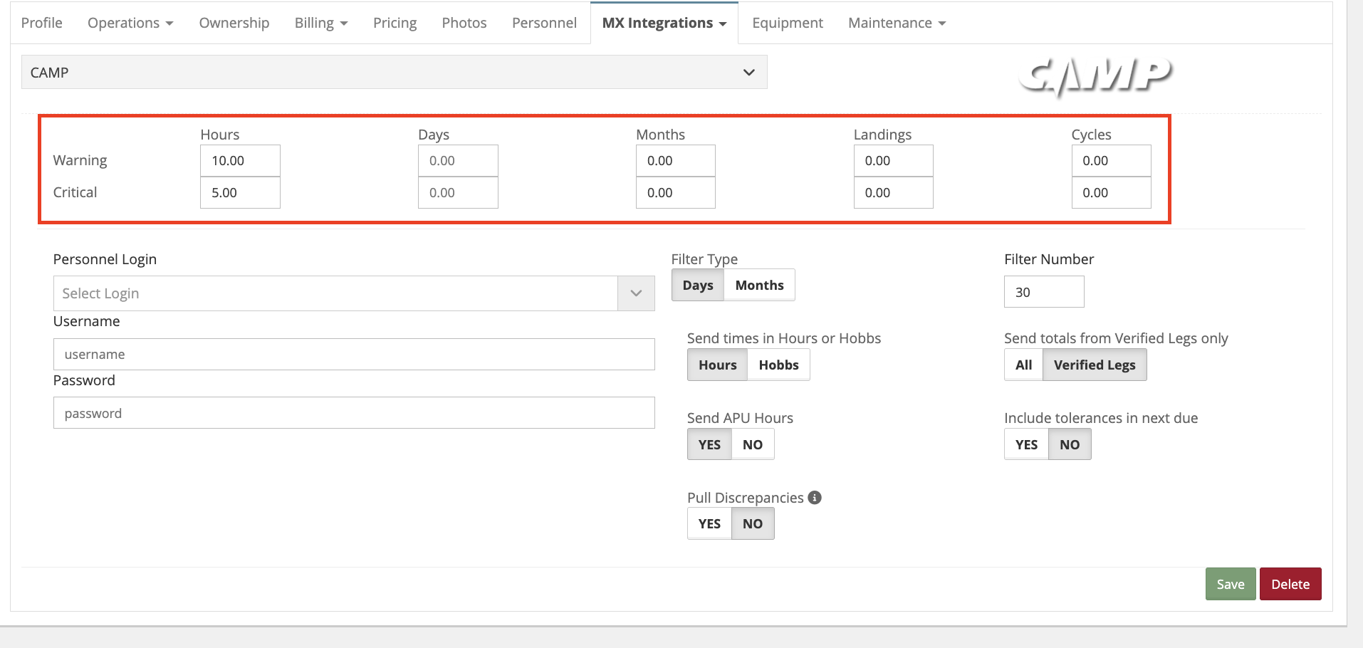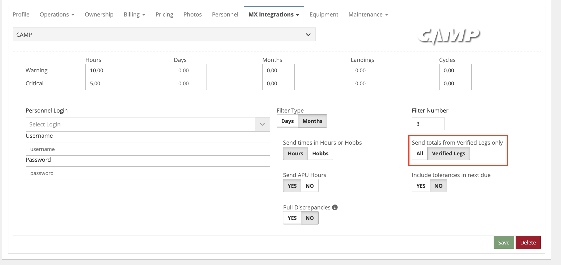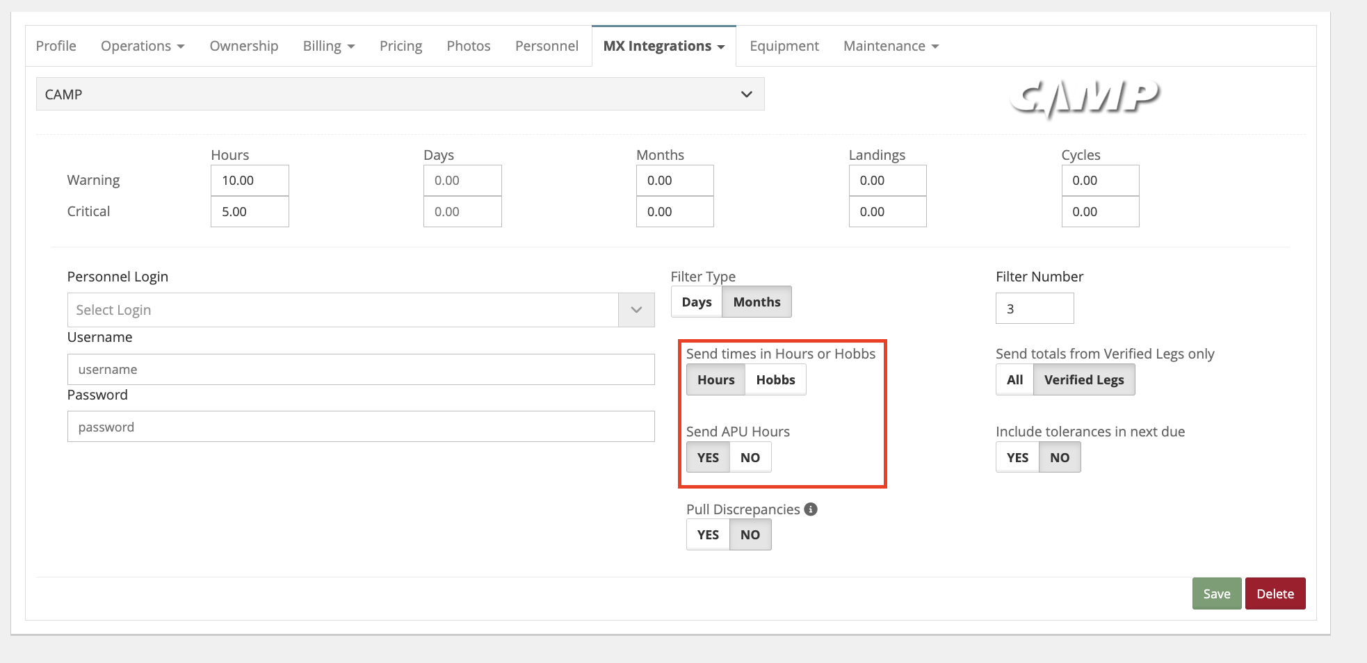 Set whether Hours or Hobbs times will push to the maintenance partner.