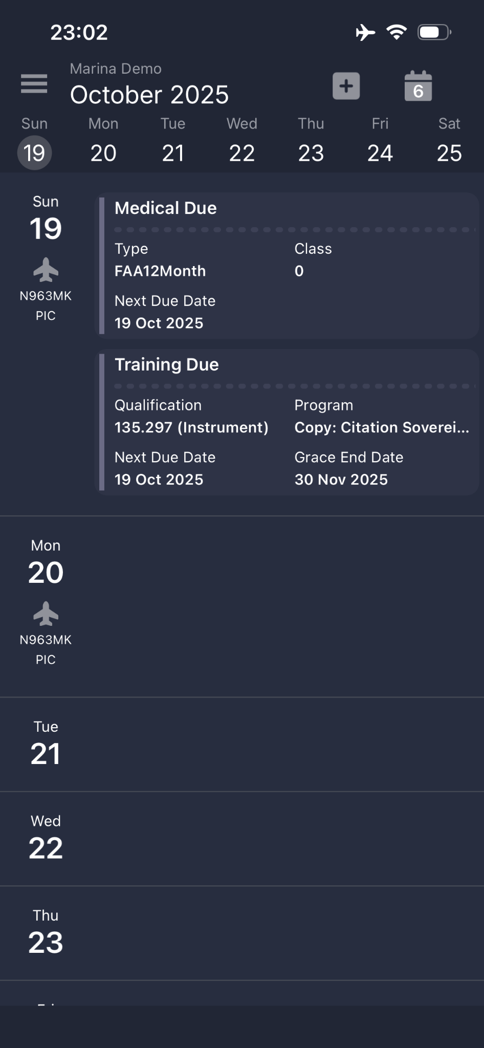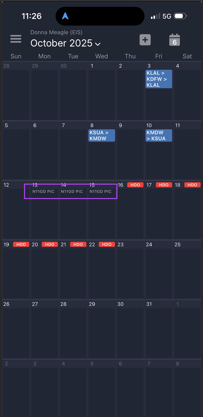At the bottom of each date, you'll find details about the aircraft you are assigned to for that day in text: