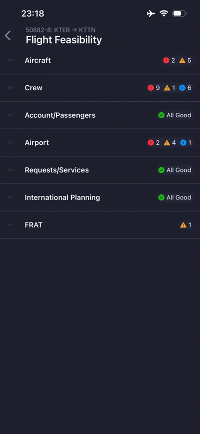 - On an expanded Flight Card on the Schedule page, tap the Feasibility indication word.