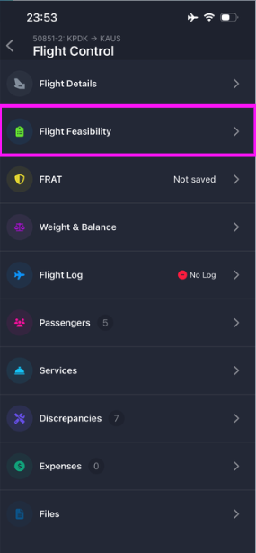 - From the Flight Control page, using the Flight Feasibility selection; or