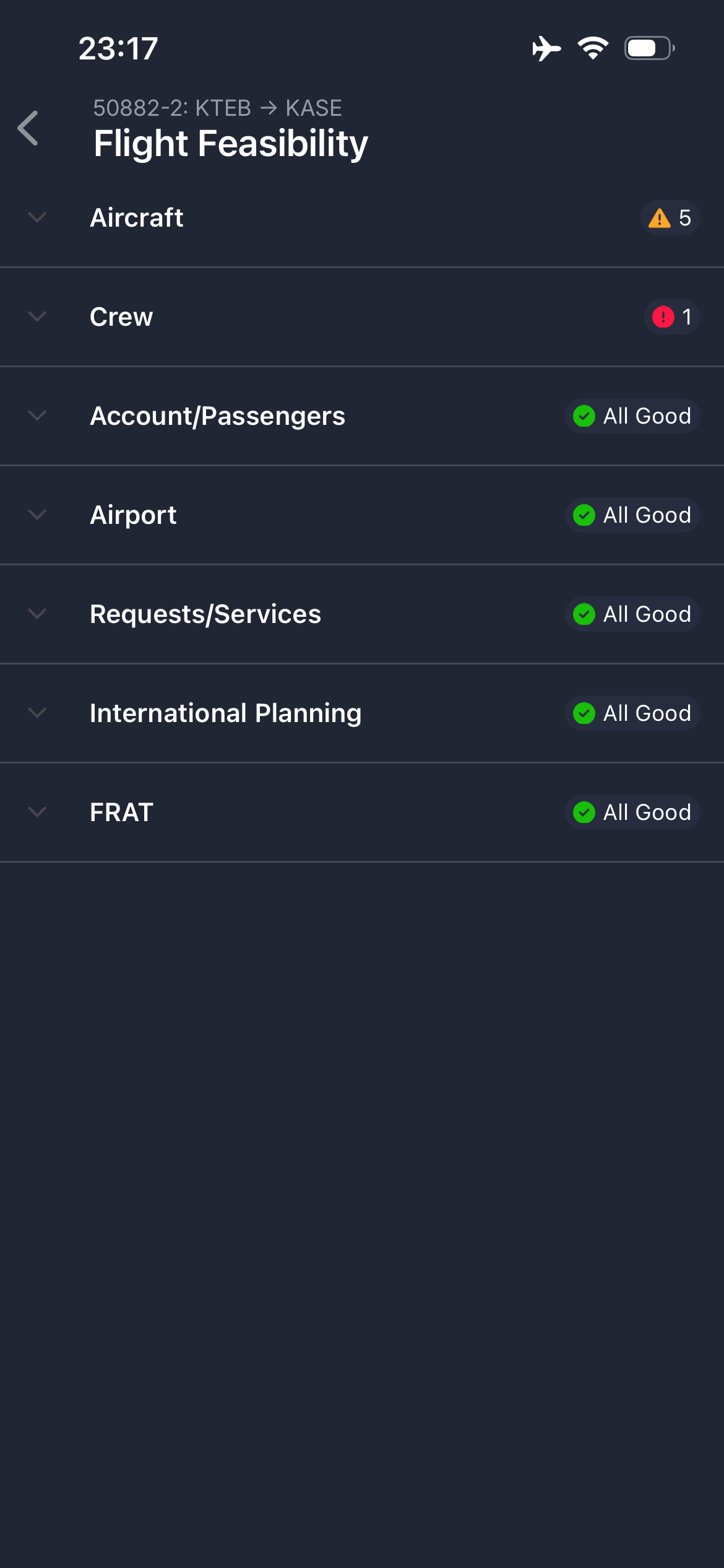 The Flight Feasibility page is where you can review a comprehensive set of automated checks, or flight check rules, that your organization has configured to ensure a flight meets all necessary requirements. This page is informational and for review only; you can't take action directly from this screen. However, the information you see here is the exact same data dispatchers will see in the web application, providing a unified view of the flight's status.