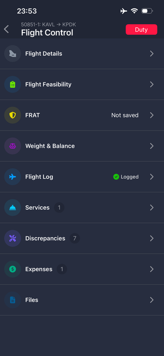 Red "Duty" button | Flight log has been saved but no overlapping duty record exists. | Tap the button to open the Create Duty screen. |
