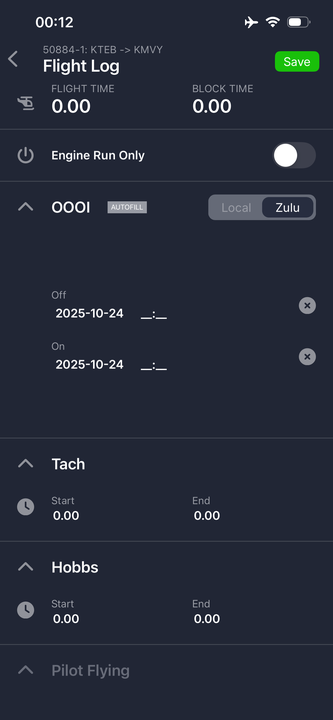 Multi-Pilot Editing: Please note that if multiple pilots are editing the Flight Log simultaneously, the last save "wins." The most recent save action will overwrite any previously saved versions of the flight log, so coordinate with your crew.
