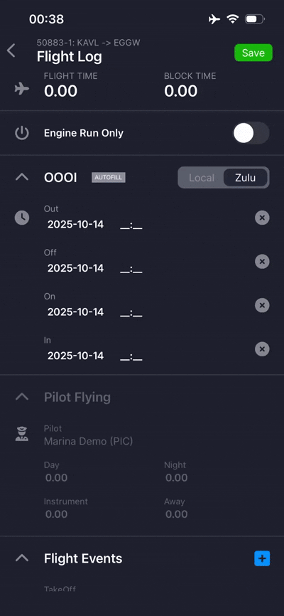 You can manually enter the OOOI times using your keypad. If your organization's settings permit, you can log these times in either Zulu or Local time by changing the toggle in the upper right of the section. To clear an entered time or date, press the 'x' next to the value.