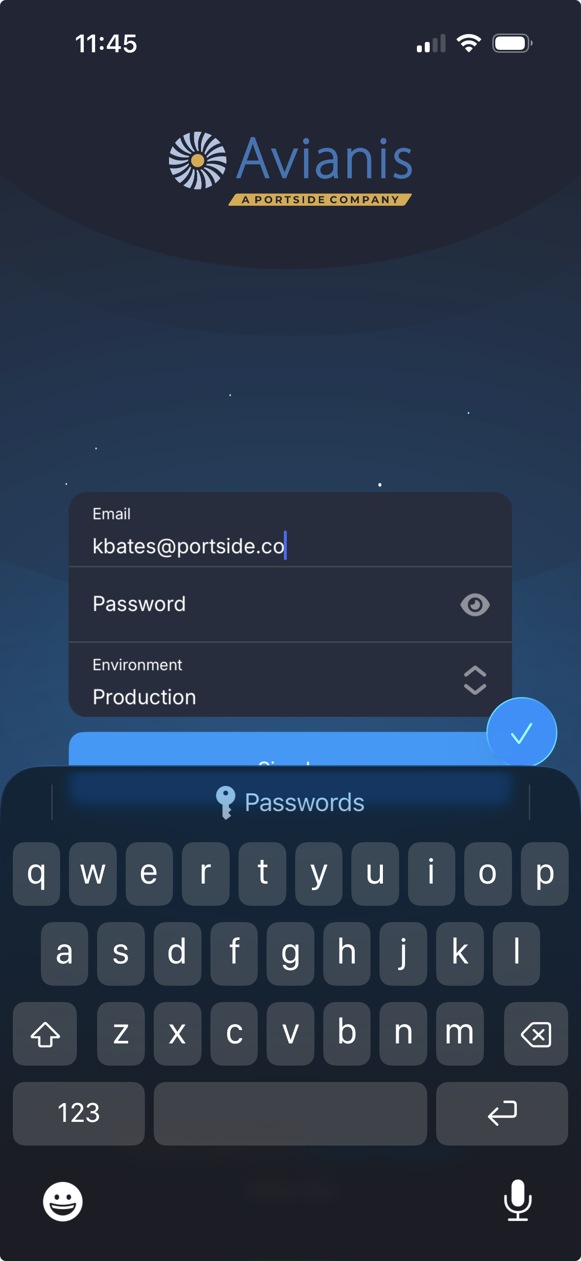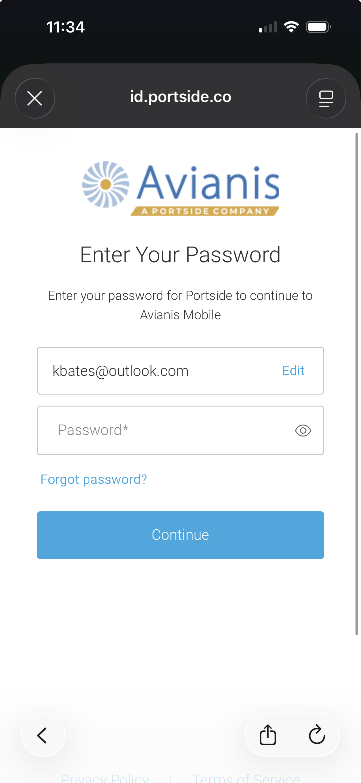 Input your username/email, tap the checkmark, this redirects you to the Portside SSO.