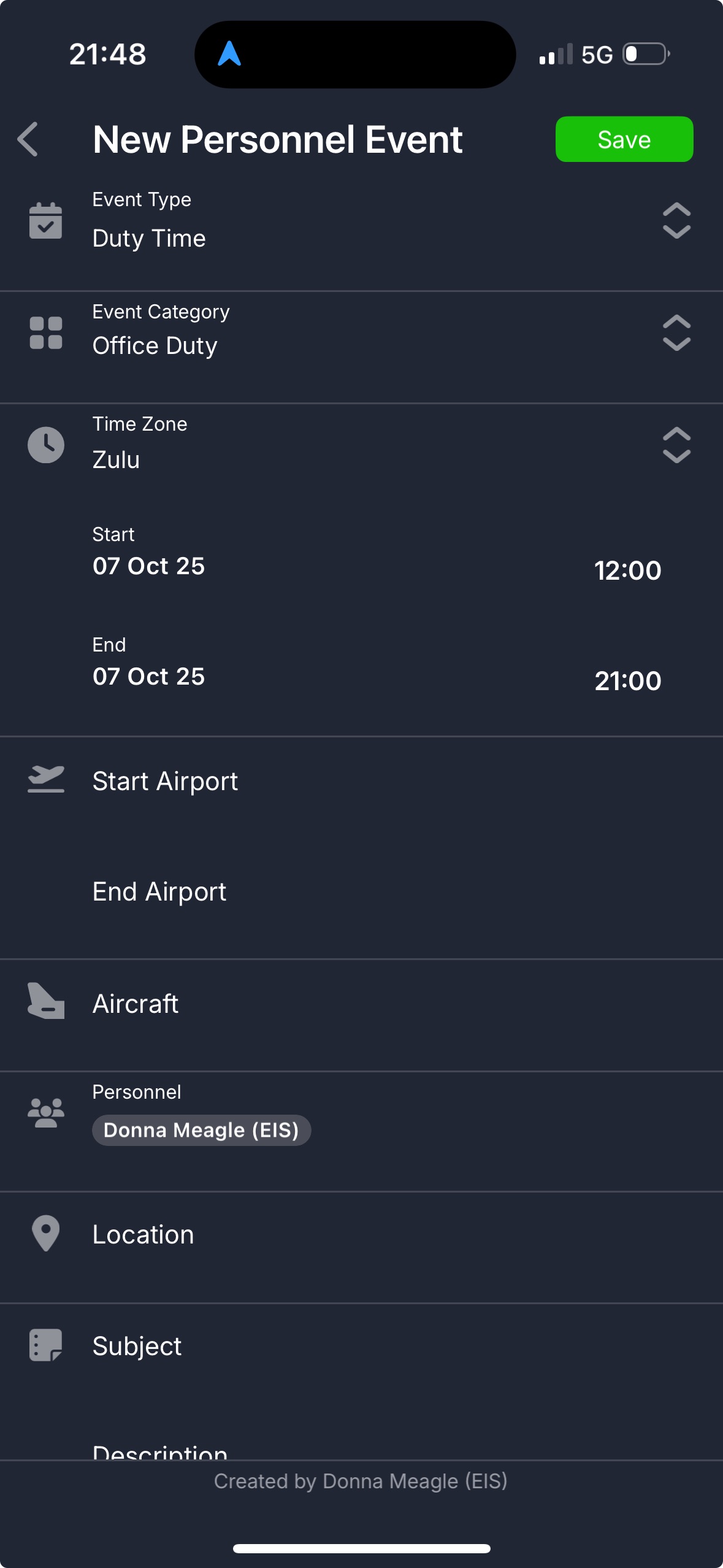 - Personnel*: The event will automatically populate with your name. To add others, tap the Personnel field to type to search and add.