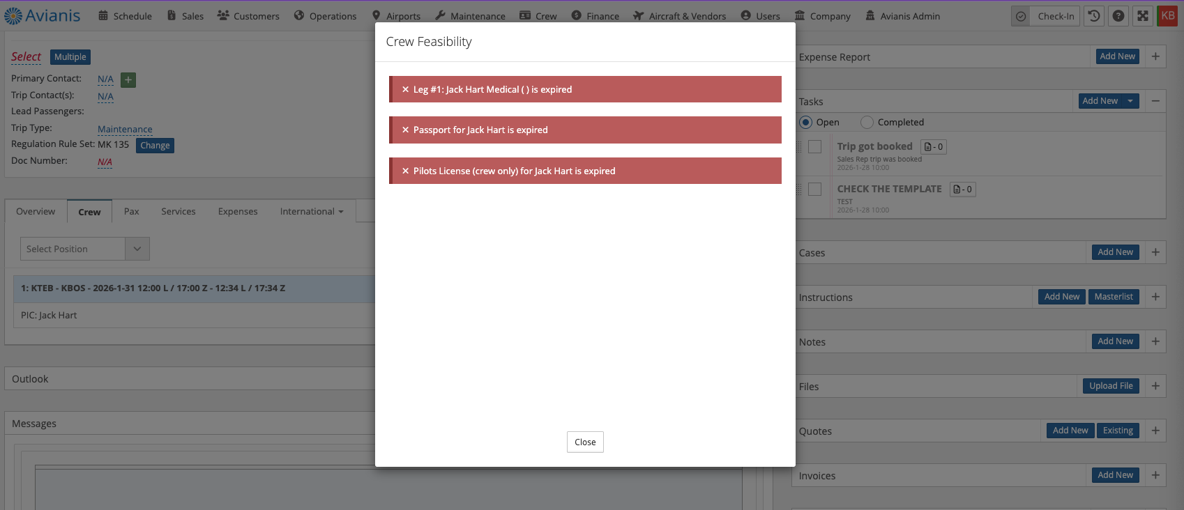 When set to 'yes' and crew members are assigned to trips and flight legs, a pop-up displays all applicable crew conflicts that are listed in the Trip Feasibility > Crew section. Items include travel document status, medical status, training currency, regulatory set limitation, scheduling conflicts and experience checks as well as crew acknowledgement status (if enabled).