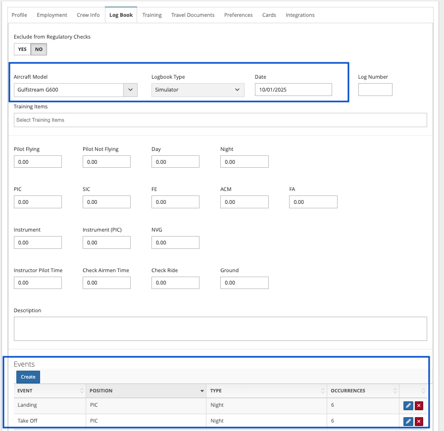 - Logbook Type > Simulator if the events took place in a Full Motion Simulator. Use Baseline if these events are the start of the crew members Take Off and Landing currency.