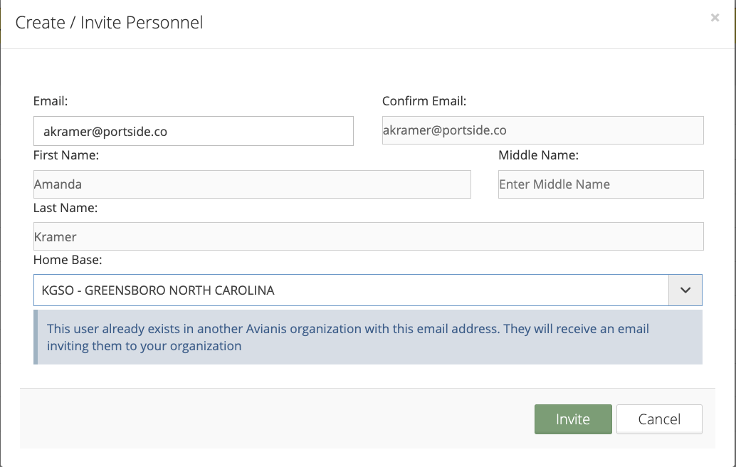 Input the email/username. Once the email address is added it will look across all Avianis accounts. If the email/username already exists, it will auto fill the First Name, Middle Name (if applicable), and Last name. Home Base is required to be entered.
