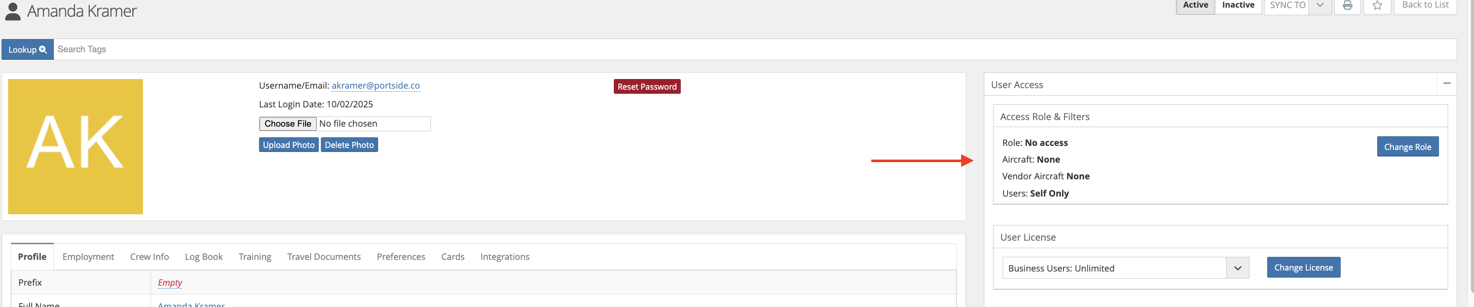 Once the user is created, clicking "Save" will redirect to the full personnel profile. From there appropriate access roles, restrictions and filters are assigned under the User Access section on the right hand.