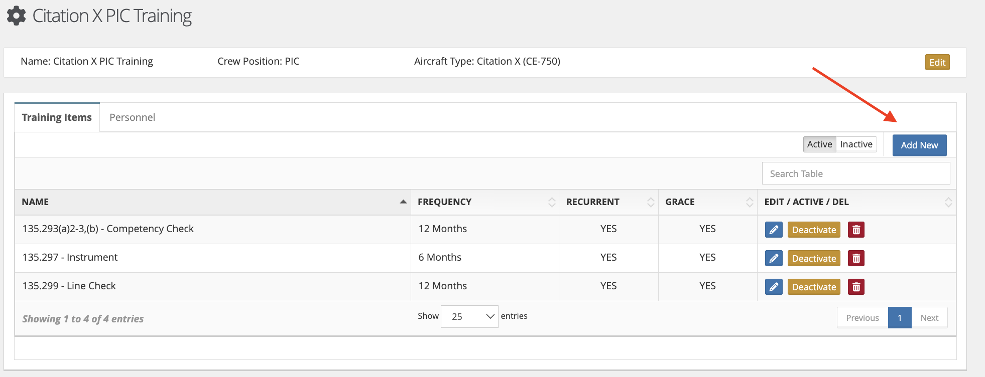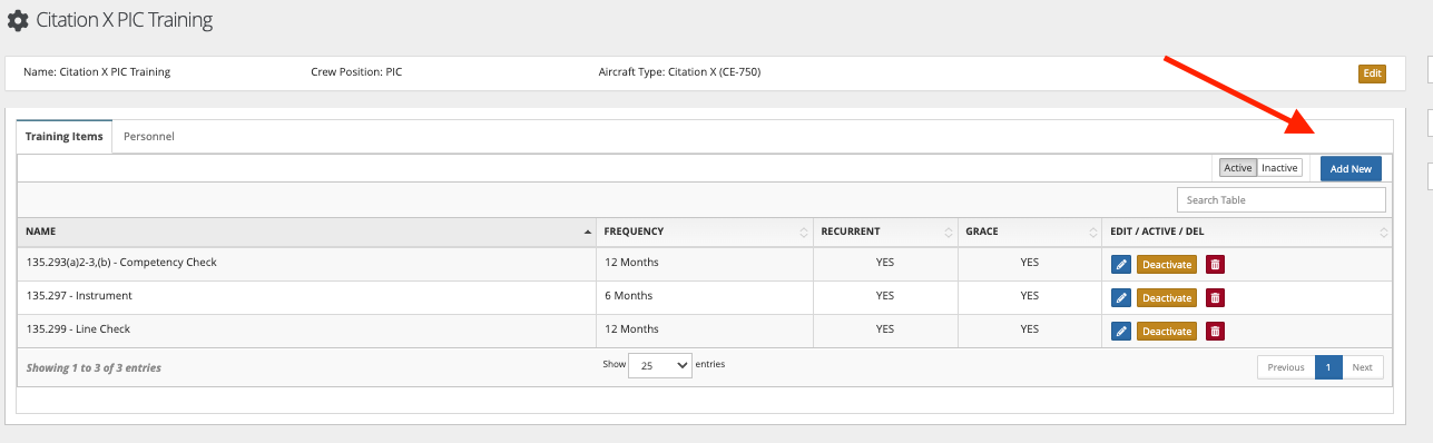 - Add all training items pertaining to the Aircraft Type Rating for the specific PIC training program, by clicking the "Add New" button. For example, 135.299, 135.297, 135.293(a)2-3,(b).