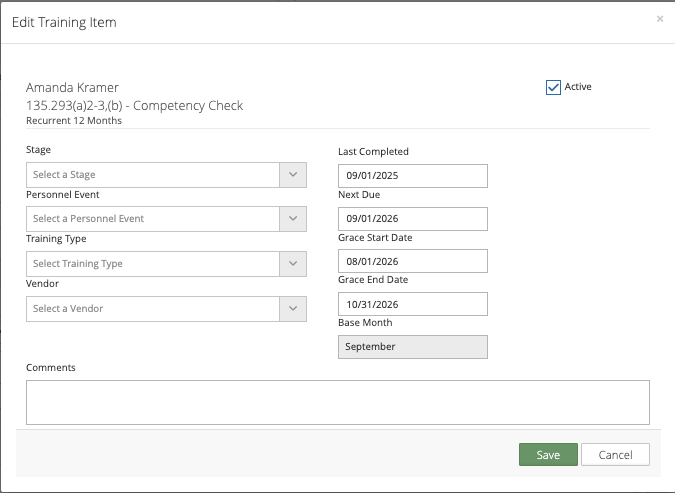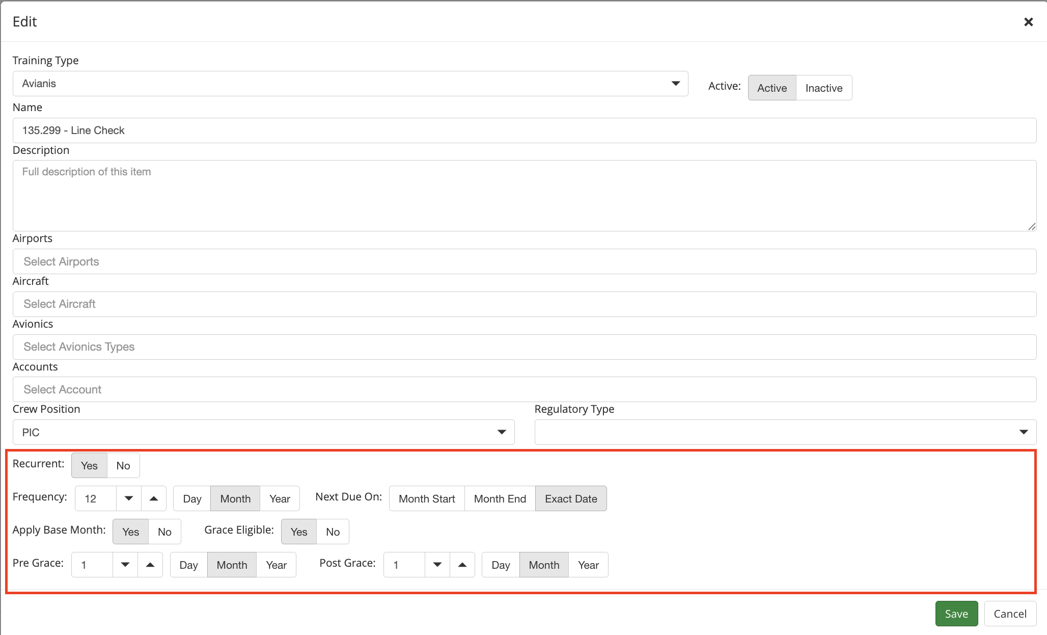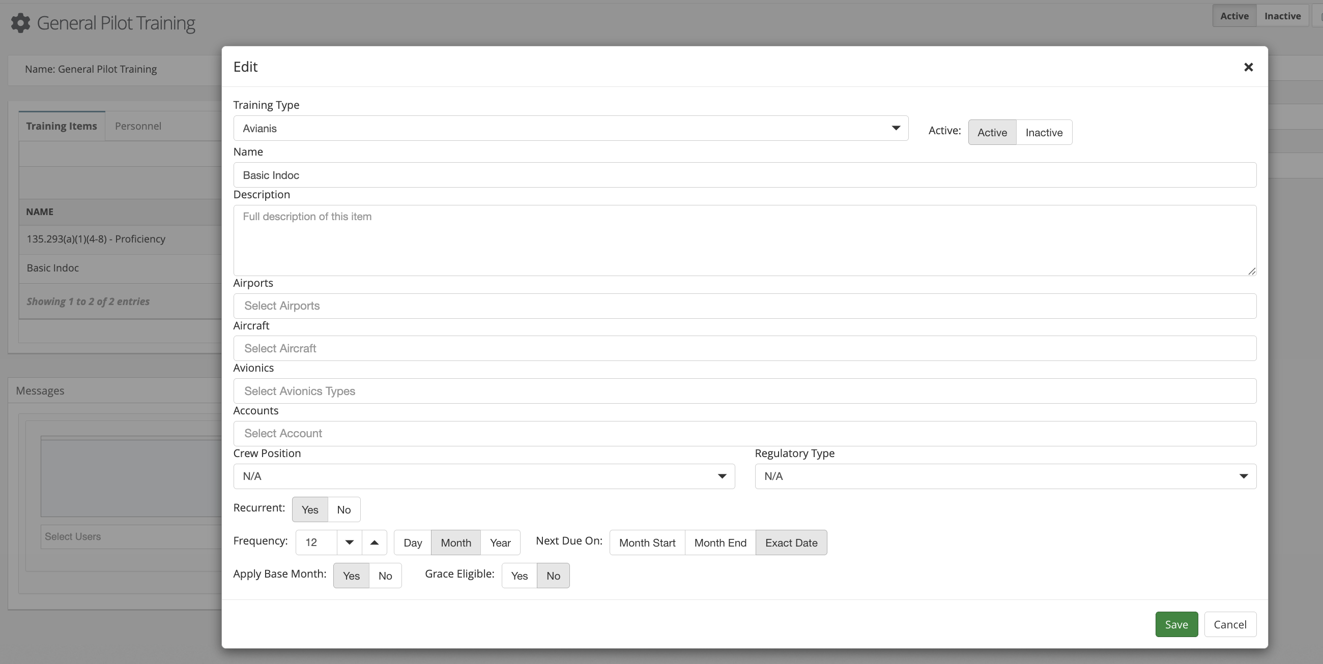 - Frequency: Set how often the training items needs to be completed with units of Day, Month, or Year