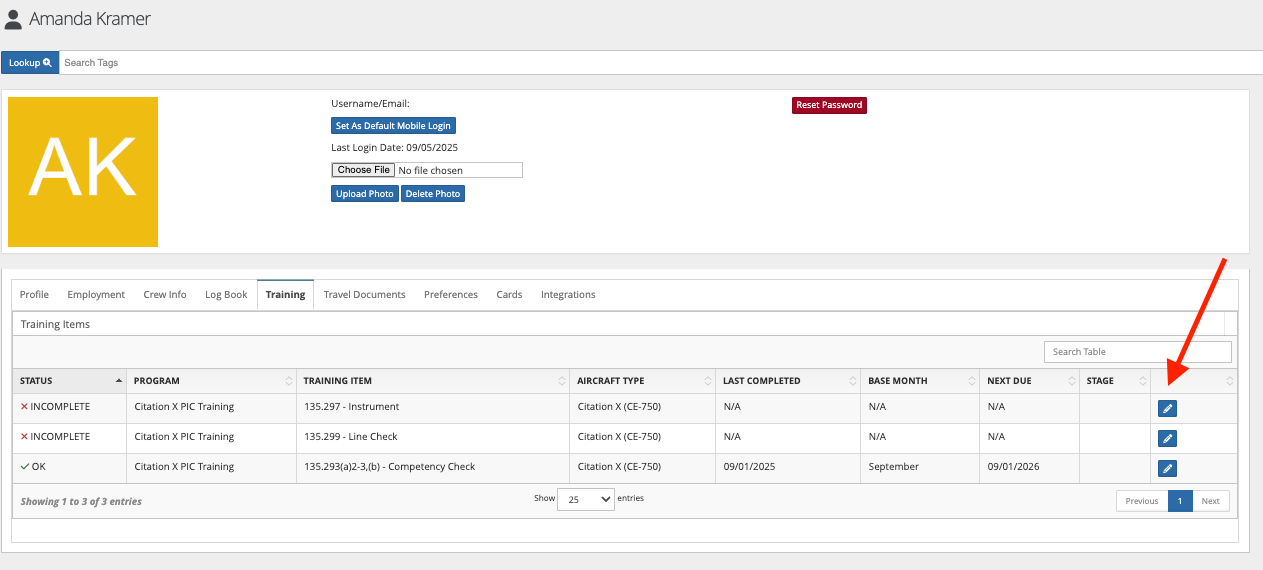 Within the training program on the personnel tab, click edit next to the personnel name.