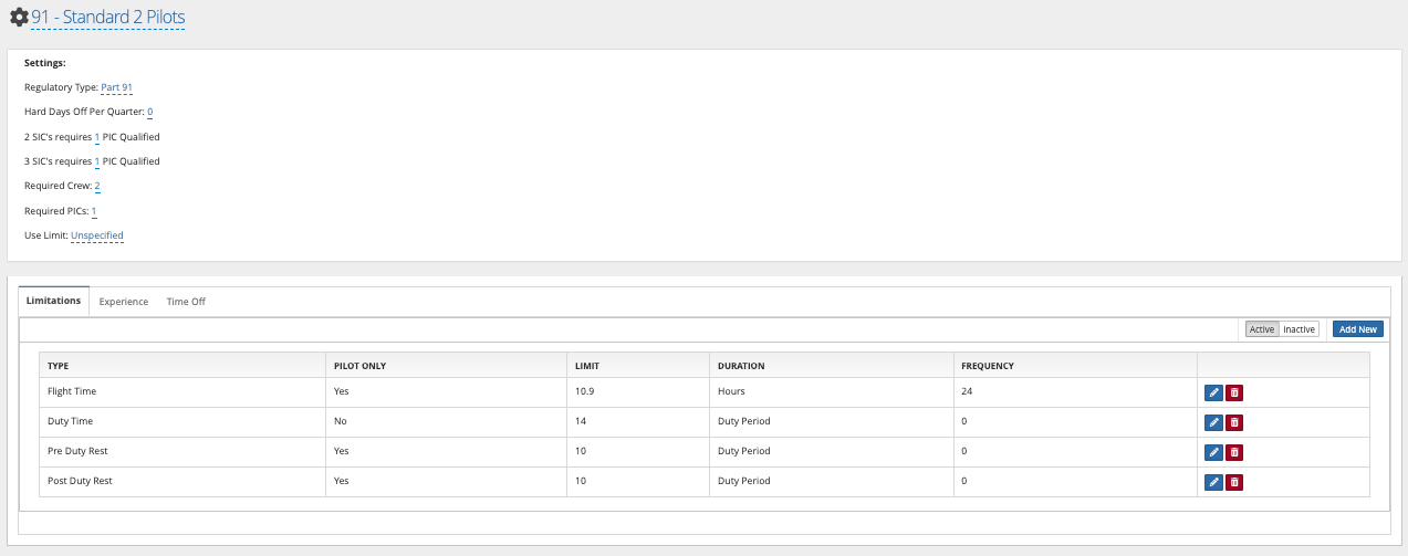 Regulation Rule Sets are a way to check pilot crew activity (e.g. duty time, rest time, flight hours, night landings, etc.) against a defined standard or limitation. Once created, they may be applied to a trip or flight leg, which then checks the crew assigned against the requirements and issue an alert or warning in the Trip Feasibility accordingly.