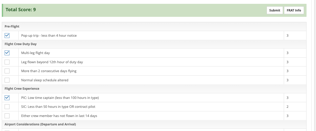 Check the boxes next to the applicable risk items for that flight and click "Submit"