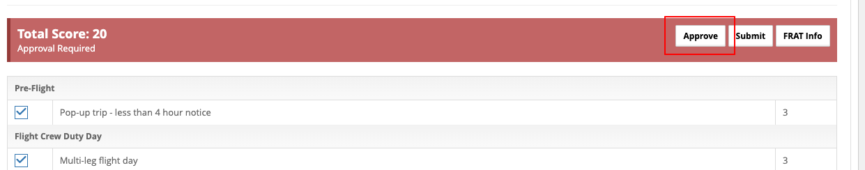 Note: If the FRAT approval is marked "show" in Operations > Settings > FRAT, the "Approve" option will be present. Click "Approve."