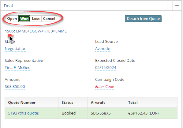 Next to the Lead Source: Avinode, a button with link to access the Avinode RFQ is available.